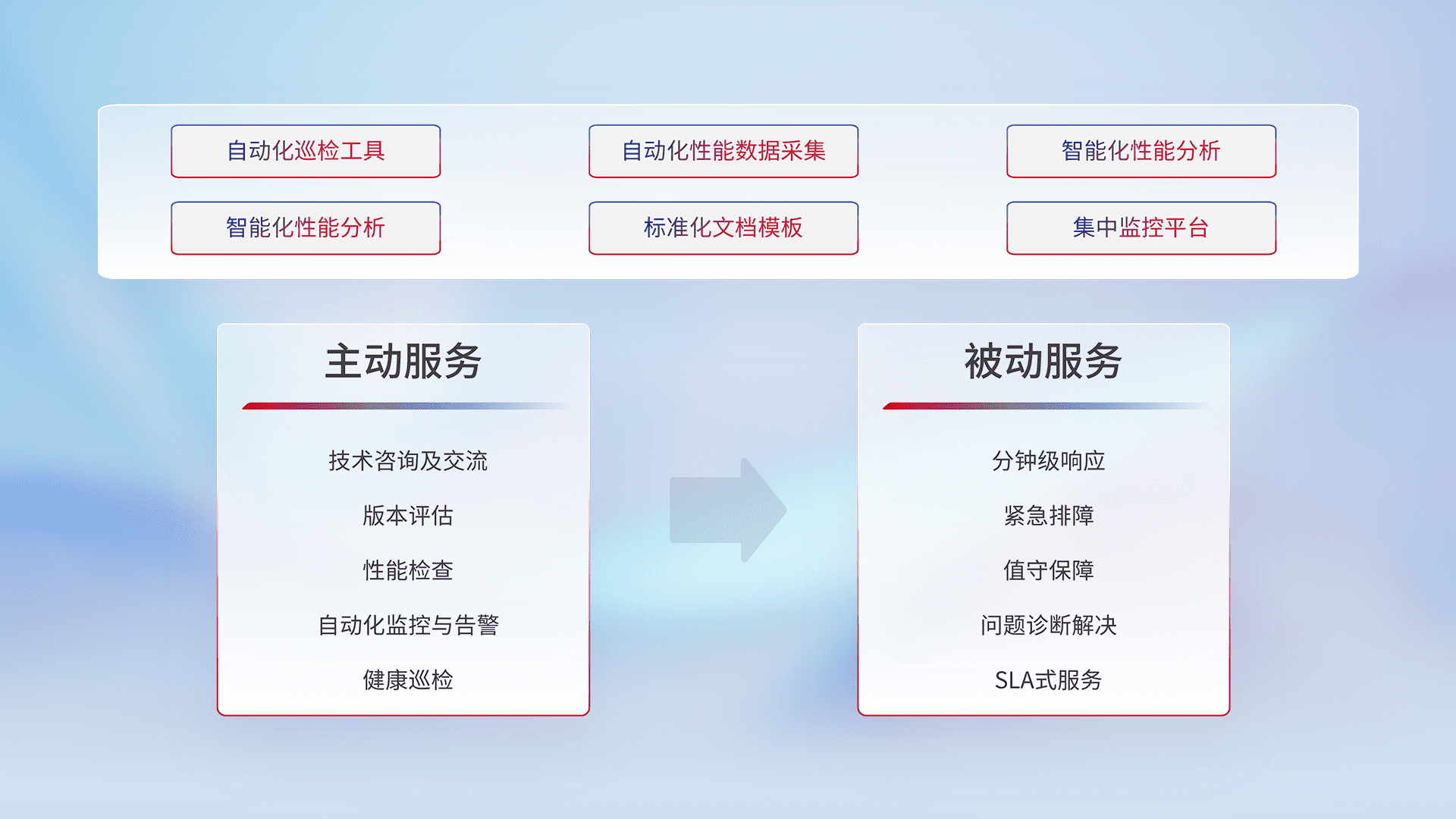 智能化工具和标准化文档,,,保障服务质量,,,,提供主动服务(包含技术咨询、、版本评估、、性能检查、、、、自动化监控与告警、、、健康巡检)和被动服务包含(分钟级响应、、、、紧急排障、、、值守保障、、问题诊断解决、、SLA服务)。。。